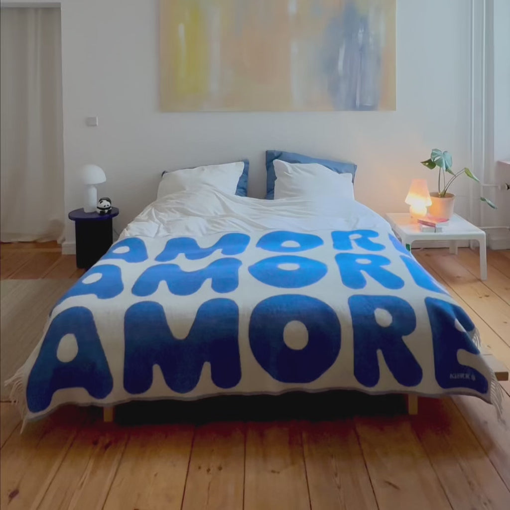 Our iconic AMORE blanket just got a stunning new shade: a rich, vibrant blue that’s pure magic.