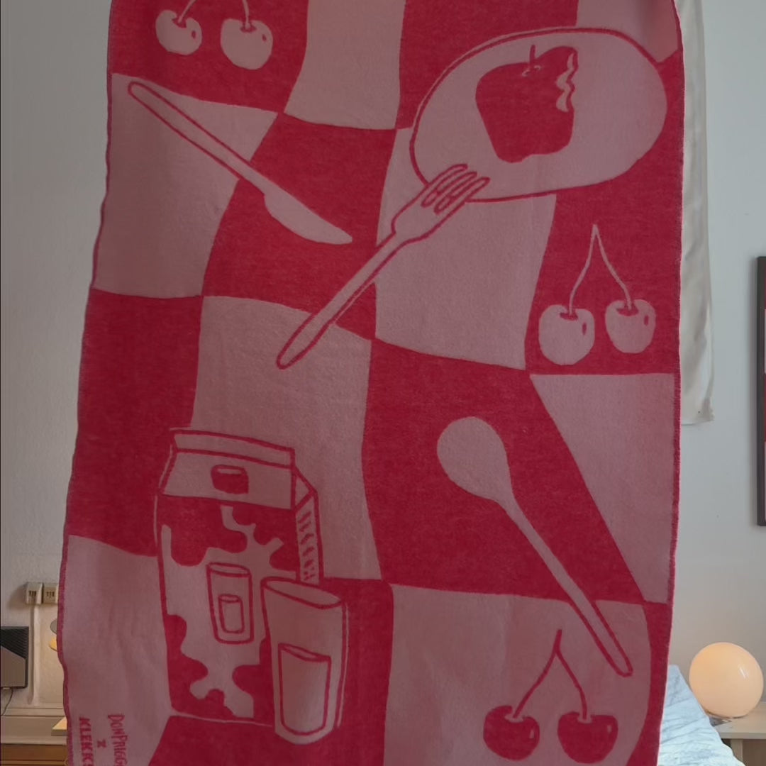 Together with artist Annika Don Prigge, Klekks No. 33 brings one of her most iconic motifs in Cherry Red and Soft Pink to a wool blanket - with cherries, fork, milk, and looots of coziness ❤️